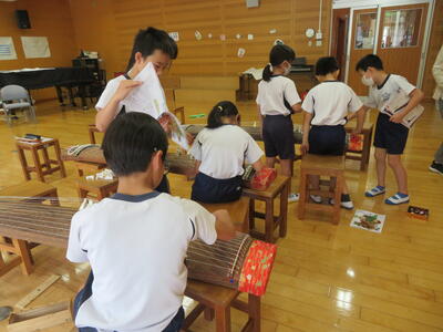 今日は4年生の音楽で、「さくらさくら」を箏で演奏してみました。七七八~七七八~数字を見て箏を弾きます。
