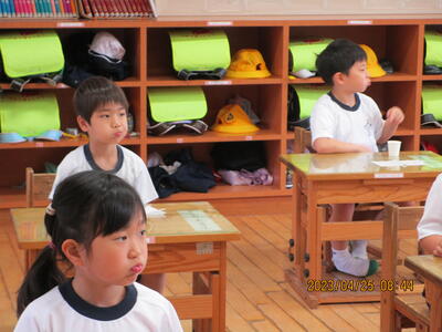 今年度1回目のフッ化物洗口です。洗口液を口に含んで1分間ブクブクをします。1年生も上手にできました。