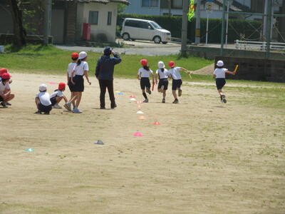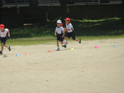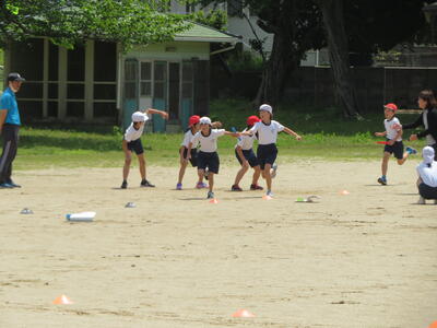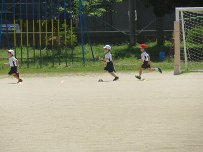 運動会に向けて、かけっこの練習をしています。力いっぱい走るお友達に大きな声で応援していました。高学年はダンスの練習です。運動会が楽しみです。