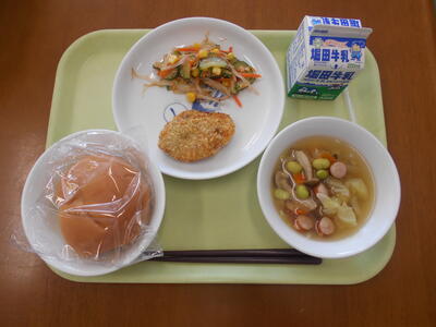 5月11日の献立は『まるパンカット、平めんスープ、ソースカツ、にんじんサラダ、スライスチーズ』でした。今日は、給食センターからの運動会応援メニューで、勝負に勝つように「ソースカツ」をつくっていただきました。サクサクのカツにほんのり甘いソースがしみこみ、子供たちや先生たちから「おいしい!」という声が上がっていました。運動会練習で疲れた体にエネルギーがチャージされたようでした。明日も元気に練習頑張りましょう。