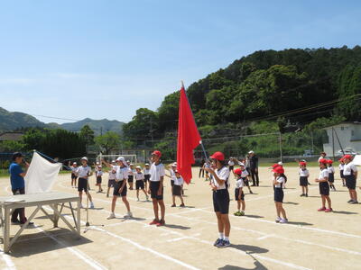 本年度の運動会スローガンは「みんな燃え上がれ 笑顔 全力 勝利めざして」です。