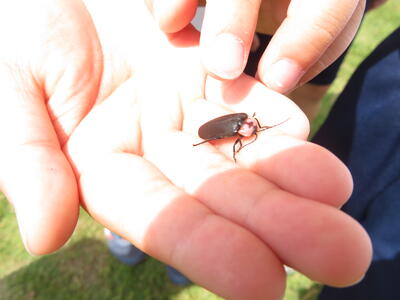 低学年の子供たちは、外で遊んでいます。そうしたら、げんじぼたるを発見。