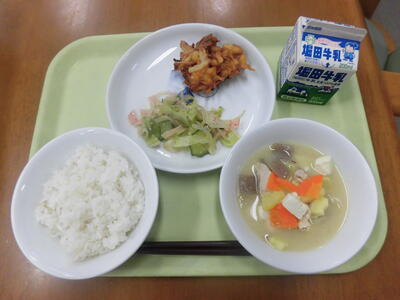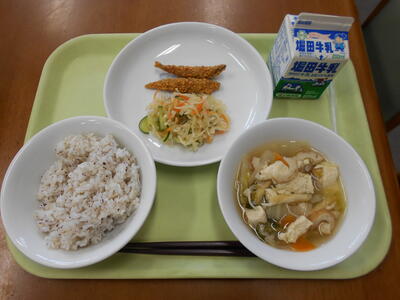 今日の献立は、「ぞうに、ホキてんたまあげ、海藻サラダ」でした。お正月らしい紅白のおもちがはいった「ぞうに」、子供たちが美味しそうにお餅をほおばる姿が見られました。「ホキ」というお魚の揚げ物も、さくさくとしていてとても美味しかったです。毎日、美味しい給食が食べられることに、心から感謝です。
