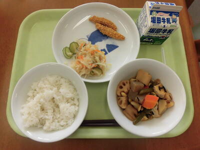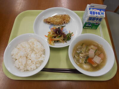 今日の献立は、『麦ご飯、大豆の磯煮、きびなごフライ、切り干し大根の酢の物』でした。たくさんの根菜類がはいった栄養満点の磯煮は食べごたえがありました。きびなごフライもとてもおいしかったです。願わくば、あと2~3匹食べたかったです。酢の物もちょうどいい味で美味しかったです。