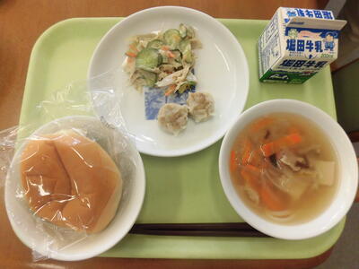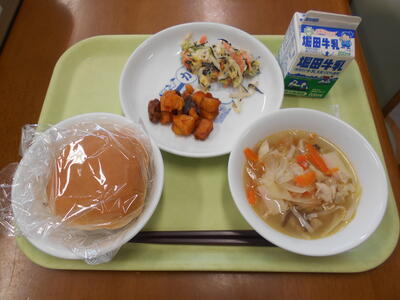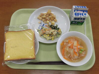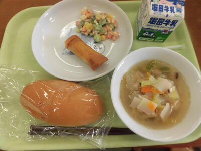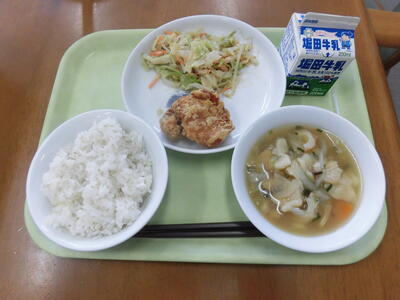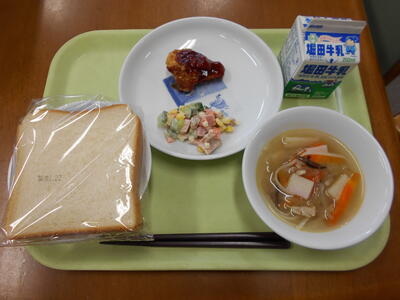 今日の献立は、「食パン、ひらめんスープ、ヤンニョムチキン、ビーンズサラダ」でした。今、ちょっとブームの韓国料理ですが、今日のヤンニョムチキンもその一つです。カリッと揚がった唐揚げに、甘辛いソースがたっぷりかかって、おいしさを引き立てていました。あっさりとしたひらめんスープとも相性バッチリでした。昨日は、栄養士の先生に給食について話をしていただきました。いつも心を込めて作っていただいていることを感じました。ありがとうございます。