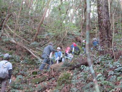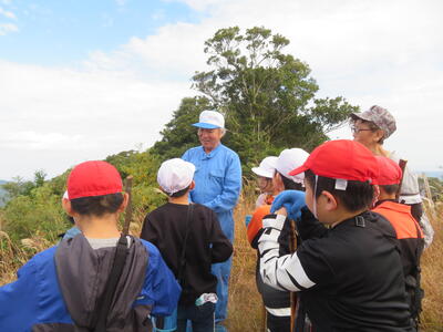 (3年生天草体験学習「官山登山」)今日は、福連木の官山を登り、福連木の自然、歴史を体感しました。山頂に登ると、空気はひんやりして気持ちよかったです。遠い山々、そして海岸が見えました。福連木里づくり振興会長の平松さんから、「この山は江戸時代に官山とよばれ、槍の柄はこの山の樫の木が使われ、大変人気がありました。それで幕府の目にとまり、長い間、江戸幕府の領地となりました」そのようなお話を聞きました。その後は、炭焼きで生計を立てるようになって、子どもたちも日々手伝いをしていたというお話を聞きました。ここにも「福連木の子守唄」の時代背景がありますね。