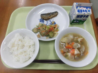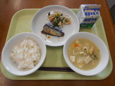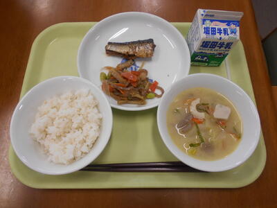 今日の献立は、『武光公なべ、イワシの梅煮、にんじんきんぴら』でした。「武光公なべ」とは・・・?。すっかり、豚汁と思って食べた後、メニューを見てびっくり・・・。「武光公」とは、650年ほど前、菊池地域を治めていた殿様だそうです。戦の前に栄養たっぷりの鍋を食べていたそうです。本当に力がわいてきそうな鍋、やわらかく煮込んだイワシ、いろんな具材がはいったきんぴら、味も栄養もばっちりで、身体もあったまりこの寒さに負けない元気をいただきました。