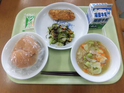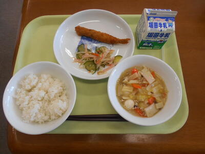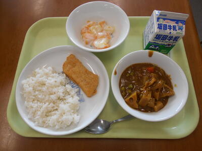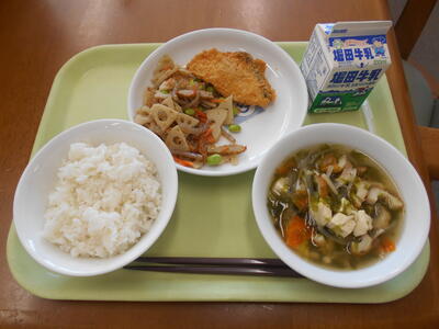 今日の献立は、『麦ご飯、もずくのかき玉汁、天草産チヌフライ、糸こんにゃくのピリ辛いため』でした。「さすが!天草産チヌ」食べごたえのある厚い身とサクサクの衣、素材のよさ天草は、やっぱり宝島です。とろっとしたもずくのかき玉汁もやさしい味でおいしかったです。糸こんにゃくのピリ辛いためもとてもおいしかったのですが、つるつるとすべる糸こんにゃくをつぎわけるのに苦労していたようでした。今週もごちそうさまでした。
