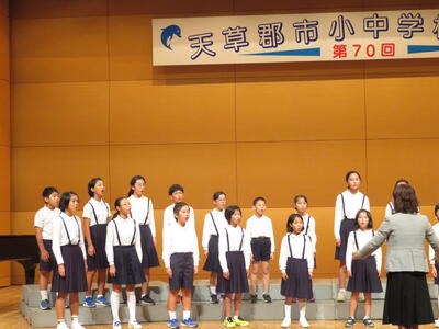 天草市民センターで、音楽会が実施され、天草小はプログラム4番、4年生から6年生で「結の歌」と「SAKURA」を合唱しました。練習の成果を発揮し、伸びやかな声で心を込めて表現。高音部と低音部の響きもうまく重なり、歌声がホールいっぱいに響きました。次は、今週金曜日の、天草体験学習研究発表会です。地域の皆さま、保護者の皆様、午後は中学校の体育館で発表します。子供たちの頑張りを見にきてください。