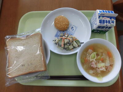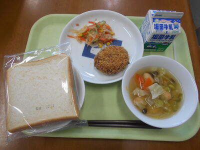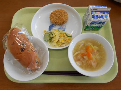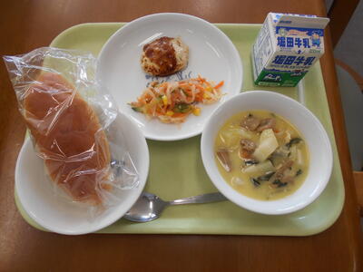 今日の献立は「レーズンパン、かぶのポトフ、手作りコロッケ、コーンサラダ」でした。今日は、やっぱり「手作りコロッケ」が主役。じゃがいもを蒸してつぶすところからタネを作り、味付けをし、形作り、一つ一つ丁寧に揚げていただいているそうです。中はホクホク、外はサクッと揚がっていてとても美味しかったです。給食センターの方々の心がこもった一品でした。
