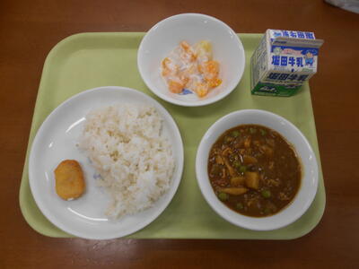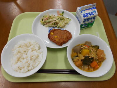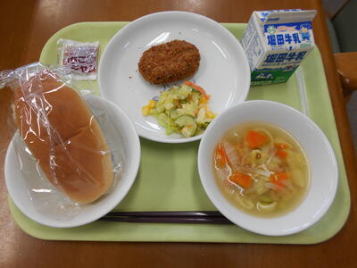 今日の献立は、「ウィンナースープ、手作りコロッケ、にんじんサラダ」でした。子供たちが、ウィンナーが何個入っているかを数えながら食べていたウィンナースープも美味しかったのですが、今日は、何といっても「手作りコロッケ」が最高でした。じゃがいもをむして潰すところから、タネを作り、一つ一つ小判型にまるめて作られるそうです。数百、数千食作るセンターではこうはいきません。天草小中だからこそできる心を込めたメニューですね。中は温かくホクホクで、外はサクサクのコロッケは愛情を感じました。ごちそうさまでした。