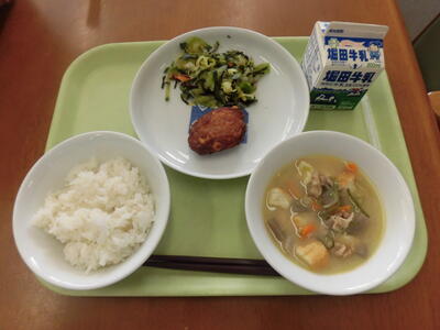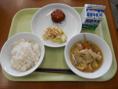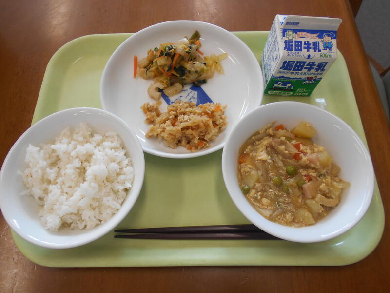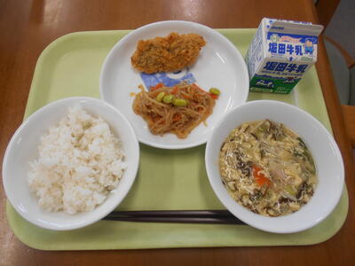 今日の給食は、『麦ご飯、中華うま煮、ししゃもフライ、中華あえ』でした。カリッとあがったししゃもフライ、野菜がたっぷり入った中華うま煮、どちらもご飯が進むメニューでした。そして、なぜか、うま煮に大好きな「うずらの卵」がたくさん入っていて嬉しかったです。