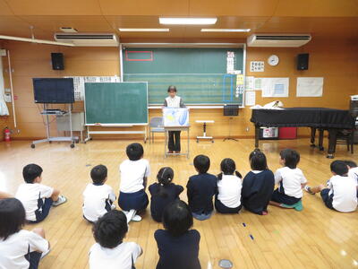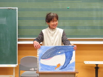 今日は低学年の読み聞かせに行合さんが来校されました。読み聞かせの内容は、行合さん手作りの紙芝居「かわいいきいろのクジラちゃん」でした。