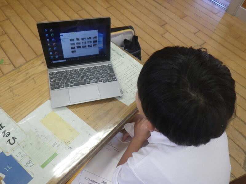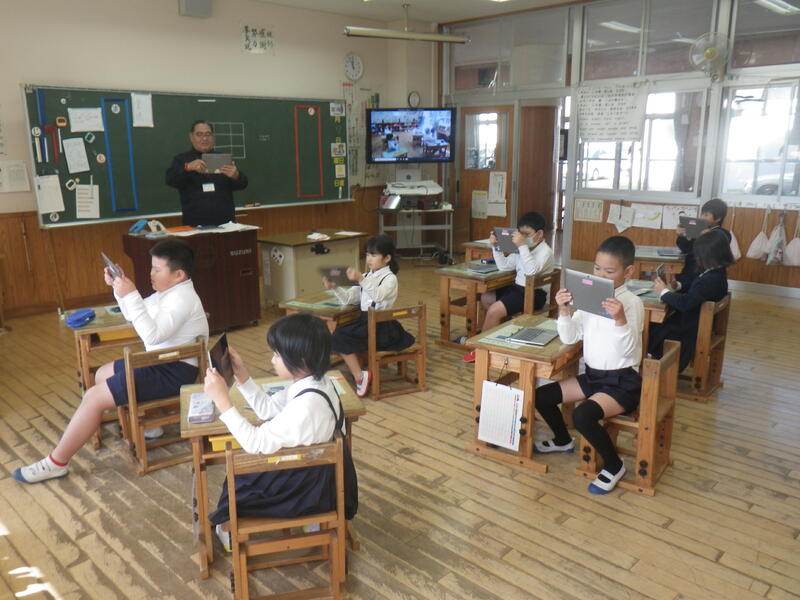 2年生はICT支援員の津末さんに先週、タブレットを使った写真の撮り方を教えてもらいました。