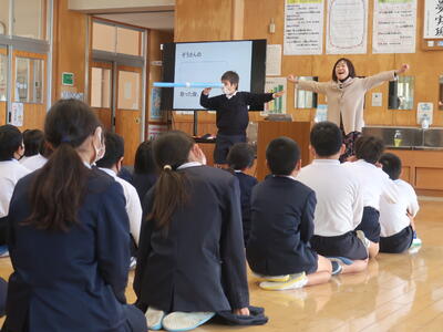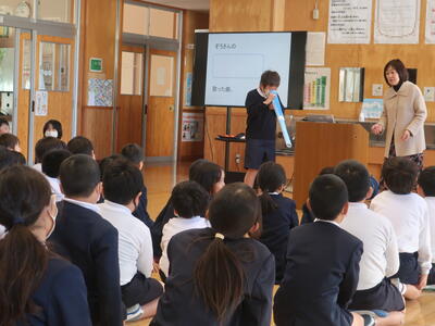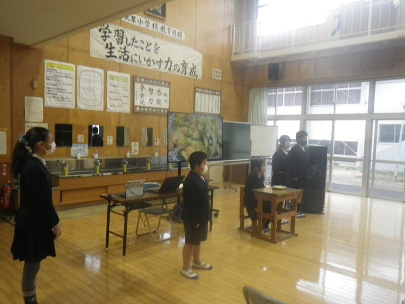 4時間目、給食集会があり、学校栄養士の先生に給食について説明してもらいました。そして、給食委員会の皆さんに好き嫌いをしないようにという発表をしてもらいました。給食に感謝して食べていきましょう。