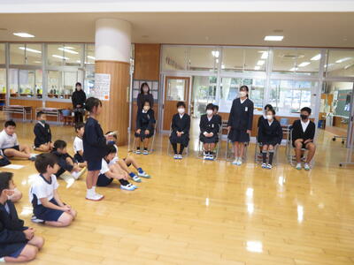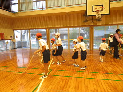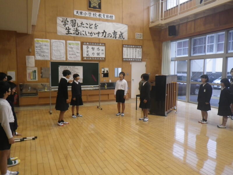 今日から長縄を使った縄跳びの練習が始まりました。縦割り班ごとに、3分間で何回跳べるかを競争します。1年生は、上級生に教わりながら跳ぶ練習をしました。今日さっそく跳ぶタイミングをつかんだ1年生もいて、すごいなと思いました。そのような体力づくりの積み重ねもあって、天草小学校は3年連続体力向上優良校として表彰を受けることができました。