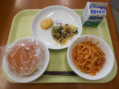 今日の献立は「米粉パン、ミートスパゲティ、チキンナゲット、海藻サラダ」でした。子供たちも、大好きなミートスパゲティとチキンナゲットに笑顔で満足そうでした。「もっと食べたいよ~」という声が聞こえてきそうでした。