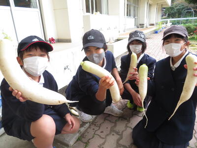 5年生が学校園で育てた大根です。立派な大根ができました。今日は新鮮な大根を使っておでんを作ります。