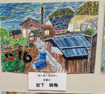 毎年、熊日新聞社主催で開催される「熊日学童スケッチ展」で見事、天草小が『優秀学校賞』に選ばれました。県内のほとんどの小中学校の児童生徒の作品が多数出品される熊本県を代表するスケッチ展です。その熊日学童スケッチ展で天小の子供たちの作品が、多くの賞を受賞しました。これは、担任の指導は、もちろんですが、本校の地域学校協働活動推進員の先生や前校長先生など、これまでご指導いただいた多くの方のおかげでもあります。天小を支えていただいている多くの方々に感謝するとともに、子供たちの身につけている力の素晴らしさに感心するばかりです。以下は、天賞、地賞に輝いた3名の作品です。
