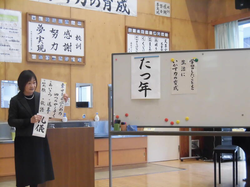 続いて校長の話です。今年の2学期はいつもの年に加えて、天草体験学習の「授業公開」そして「児童のステージ発表」と研究発表会での活躍が目立ちました。今日は「天草小ならではの宝」として、天草体験学習、歌声、福連木の子守唄、描画、硬筆、毛筆、体力づくり、縦割り班の掃除、天草小学校スローガンなどを子供たちと確認し合い、お互いの努力を讃えました。今学期も支えていただいている地域の皆様、保護者の皆様、たくさんのご協力ありがとうございました。