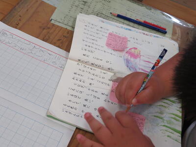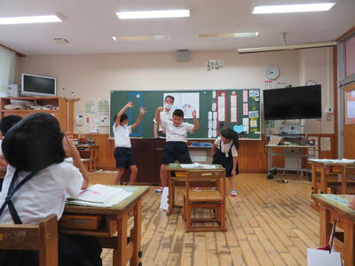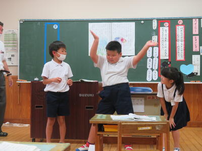 今日は2年生の国語の授業を先生たち全員で見ました。学習課題は、「どうしてスイミーは元気をとりもどしたのだろう」。前の場面ですっかり元気をなくしたスイミーが、海のいろいろな生き物を見て、元気を取り戻している場面を読み取り想像力を広げる学習です。子どもたちは、身体表現でいそぎんちゃくやうなぎなどを表し、それを見たスイミーの気持ちを想像しました。次から次に手を上げ、学習リーダーさんが指名し、たくさんの考えを交流することができました。2年生はのびのび意見が言え、体での表現も、とても上手です。