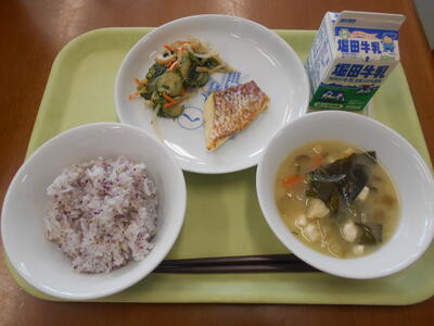 6月28日の献立は、『ゆかりごはん、ナスの味噌汁、鯛の塩焼き、ちくわと野菜のごまあえ』でした。今日は、何といっても天草産の「真鯛」は、おいしかったです。御所浦町の水産会社から無償で提供して頂いた真鯛だそうです。新鮮でおいしい魚を食べると天草に生まれて良かったとつくづく思います。やっぱり、天草は『宝島』ですね。魚だけでなく、味噌汁やごまあえにはいった野菜もおいしかったからきっと天草産かな…?