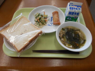 5月25日の献立は『食パン、スタミナスープ、春巻き、バンバンジーサラダ』でした。スタミナスープには、旬の「にら」がはいっていました。「にら」は、成長力と生命力が強く、おなかの消化液の分泌を促し、内蔵の働きを活発にするそうです。おいしい旬の時期にたくさん食べて健康な体にしたいですね。カリッと揚がった春巻といつもシャキシャキの野菜サラダ、今日もおいしい給食有り難うございました。