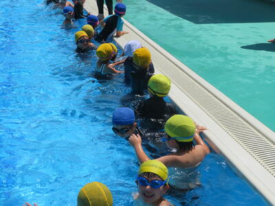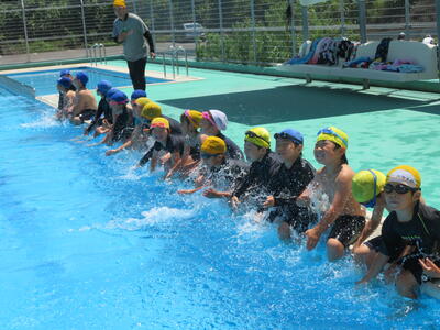 今日は天気もよく、低学年のみなさんは気持ちよさそうにプールに入っています。一年生も大プールで、もうすっかり水慣れしています。