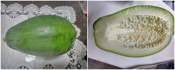 今日は、11月26日(土)が持久走大会のための振替休業日でした。せっかくなので、長(ちょう)先生から頂いたパパイヤ料理「ソムタム」に挑戦することにしました。ソムタムとは、タイ料理で人気の青いパパイヤを使った本格サラダです。まずパパイヤを切ってみてびっくり!中に白い種がびっしりです。