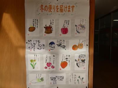 玄関前には、4年生の絵手紙年賀状が掲示してありました。
