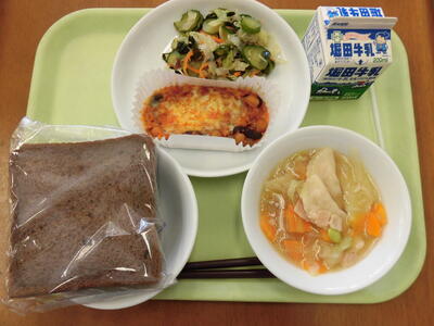 今日の献立は、「ココアパン、ラビオリスープ、お豆のミートグラタン、海藻サラダ」でした。大豆、大福豆、金時豆の3種類の豆がはいっていました。たくさんのお豆が入ったミートグラタンは、ボリュームもあっておいしかったです。ラビオリがたくさんはいっているスープを選ぶ子供たちの姿も・・・。写真からわかるように彩りも美しく、おいしくいただきました。