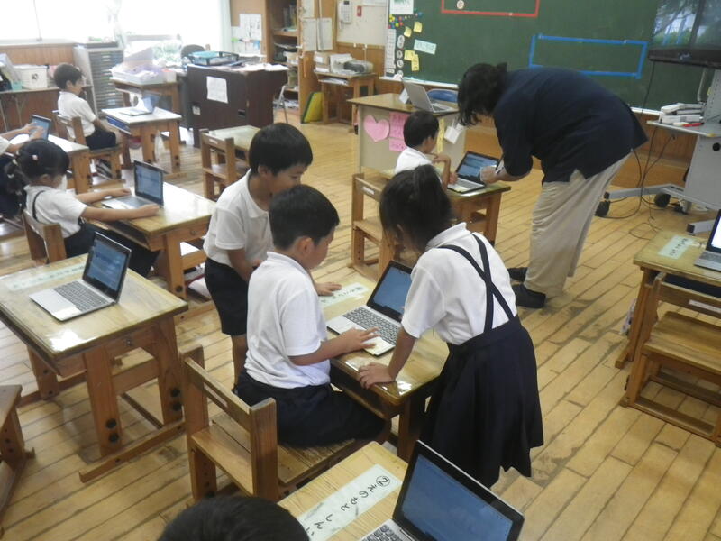 7月7日(金)1年生と2年生は、ICT支援員の津末さんにタブレットの使い方を教えてもらいながら勉強しました。