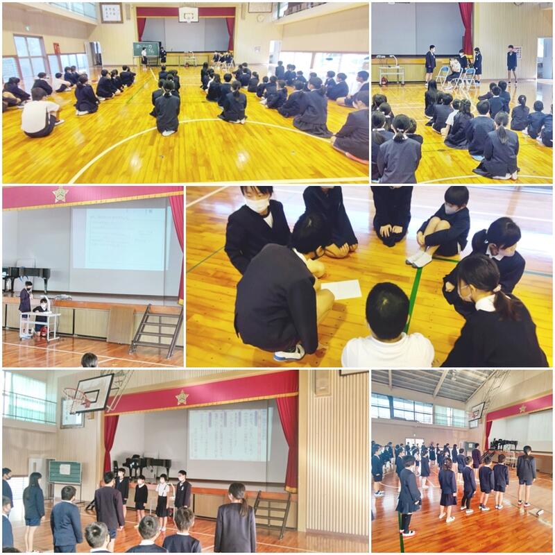 今週は校内人権週間です。その一つの取り組みとして、3時間目に人権集会がありました。児童会の運営委員さんたちが劇で問題提起をしてくれました。外国からやってきた女の子が昼休みに読書をしていて、みんなが外遊びに誘うのですが、「私は読書がしたい。」と言って誘いに応じてくれないという場面でした。「何が課題でどうしたらよいか。」を縦割り班に分かれ話し合い、班のリーダーが発表してくれました。いろいろな考え方が出されましたが、みんなで人権について深く考えることができました。それから「天草小なかよしのちかい」をみんなで確認し、今月の歌「♪友だちになるために」を唄って閉会しました。そのあと学級に帰り、まとめを行いました。
