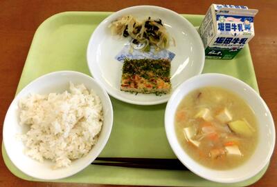 今日の給食のメニューは、麦ご飯、松風焼き、サツマイモ味噌汁です。