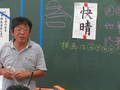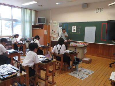 書道の講師は伊野修一先生です。学習発表会、文化展に向けて、全員頑張ろうと意欲満々です。