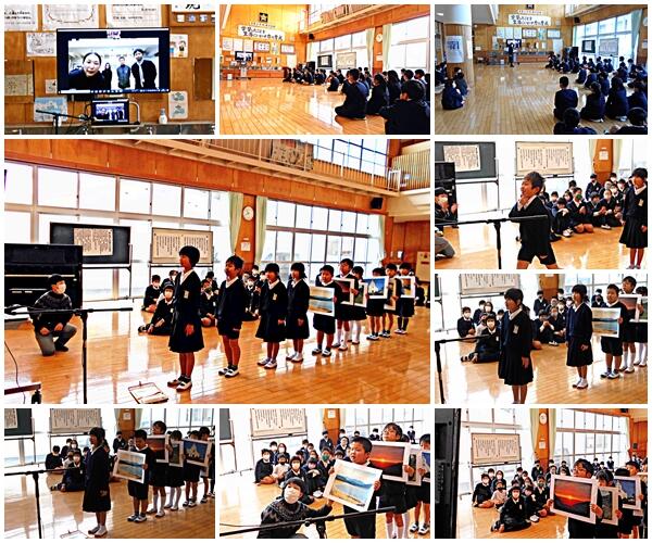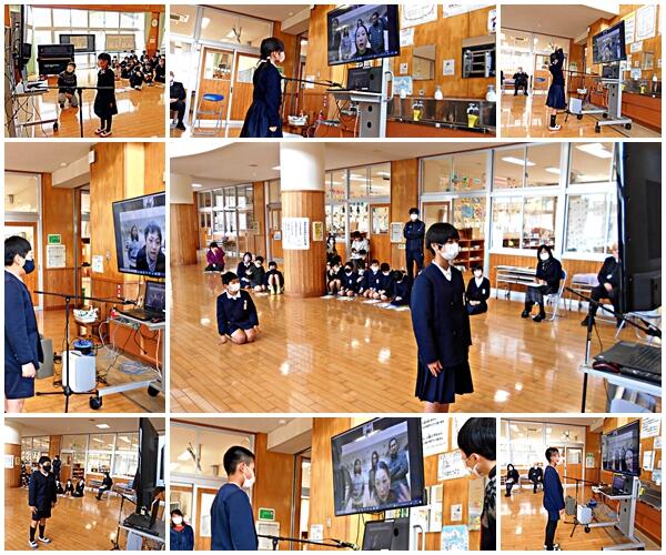 今日は、本来なら今年2月に体育館で「星の王子様」の演劇を見せて下さるはずであった「東京演劇集団風」の皆さんとオンラインで交流をしました。天草小からは1・2・3年生の児童が天草町のよいところを紹介しました。練習したとおり、上手で面白い紹介でした。