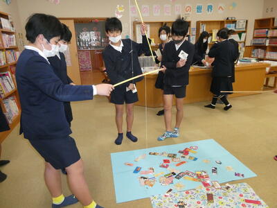 ただいま絶賛釣りゲーム開催中ですよー。しおりが釣れます。群がる6年男子。