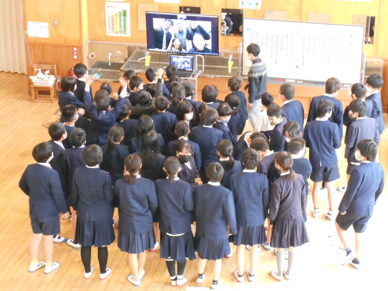 お礼の言葉のあと、子供たちはコンピュータ前に駆け寄り、いつまでも手を振っていました。
