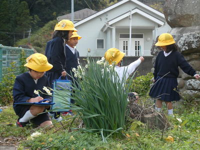 1年生が校庭で冬見つけをしました。水仙がさいていたよ!