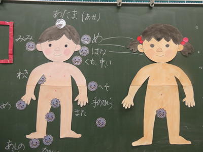 学活で「からだをきれいに」をしました。体の汚れやすい部分はどこか考えました。