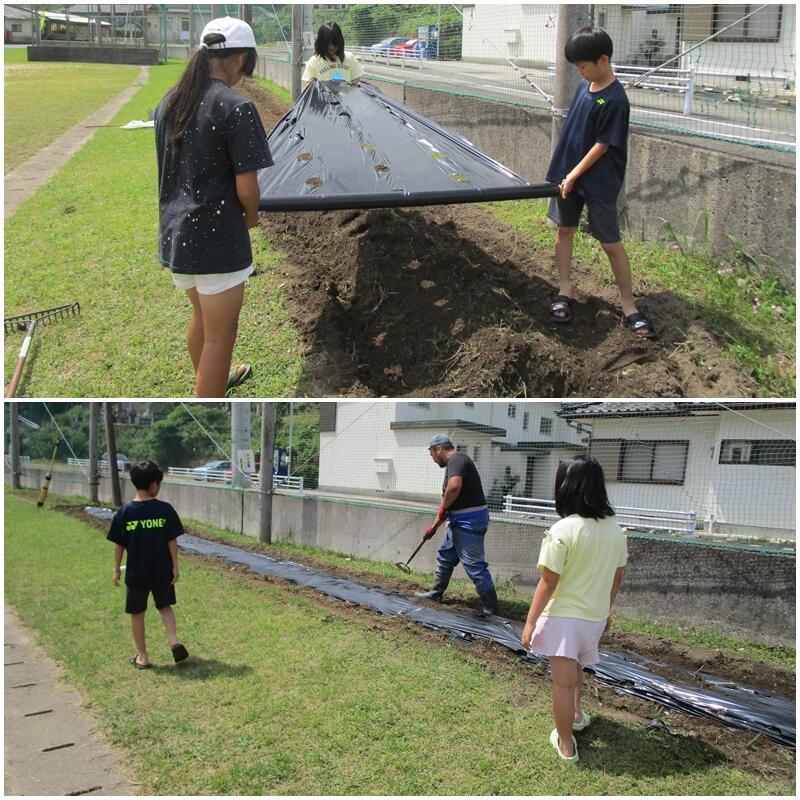 5月28日(土)に岩下さんと3人の子供達でイモ畑に肥料を入れて耕し、黒マルチを張ってくださいました。いつもありがとうございます。