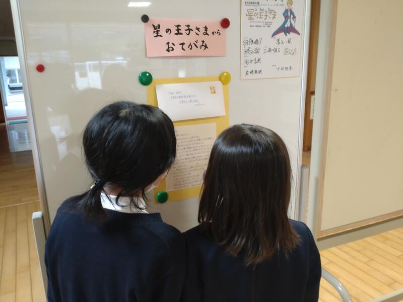 先日、本校で公演して頂いたミュージカル『星の王子様』。その王子様からメッセージが届きました。メッセージには「・・・みんなのキラキラ輝く笑顔やまなざしが今も私たちの心に残っています。とても温かい時間を過ごすことができました。・・・これからもみんなの元気な姿をたくさんの人に届けてください。・・・みなさん本当にありがとう!」と綴られていました。私たちに素晴らしいものを見せてくださった王子様から、逆に感謝の言葉をいただきました。そのメッセージを子供達も真剣によんでいました。