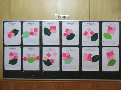 こちらは5年生の家庭科の作品です。玉どめ、玉結び、なみぬいにチャレンジしました。きれいなあじさいがさいています。