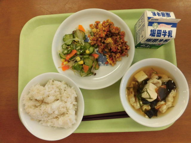 中学校は今度の土日に中体連大会が行われます。今週は中体連応援メニューです。ねばねばサラダは、あきらめない「ネバーギブアップ」の意味です。オクラのねばねば は、胃の壁を守る働きがあり、食べ物の消化吸収を助けてくれます。