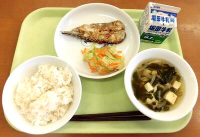 今日の給食のメニューは、麦ご飯、イワシかば焼き風、レモン和え、すまし汁です。