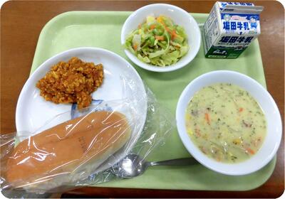 今日の給食のメニューは、セルフドライカレーパン、「コーンスープ、みかんサラダ