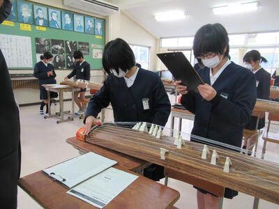 先週、6年生が天草中学校に体験入学に行きました。音楽の授業を受けて、箏を弾きました。