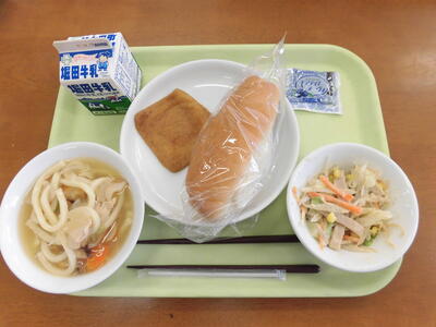 今日の給食のメニューは、コッペパン、きつねうどん、ごぼうサラダ、ブルーベリージャムです。