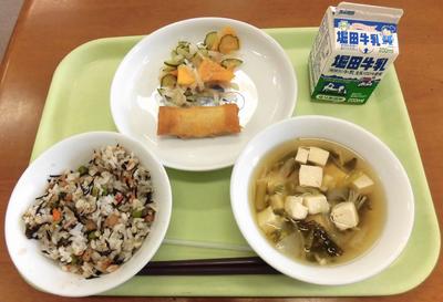今日の給食は、ひじきご飯、柿なます、豆腐汁、春巻きでした。