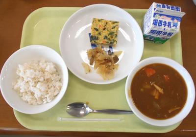 今日の給食は、きのこチキンカレーライス、野菜キッシュ風、福神漬けでした。